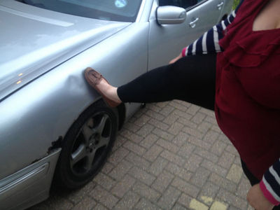 しかし、限られた予算しかなく、ほとんどヤル気がないのに一攫千金を夢見る方、ようこそ。ゲルマン最高峰のエンジニアリングの上でポーズを取る、愛してやまない私のワイフとともにご紹介させて下さい。写真をご覧になればお分かり頂けるよう、この車は様々なことを体験しております。私はこの車を過去3年に渡って所有し、愛をもって接し、維持してまいりました。この車は過酷な試練、レース、ラリー、トナカイを3頭跳ね飛ばし、 インテリアは掃除の行き届かない家庭のリビングが香ります。”サラダを食べたら?”と愛する妻に提案し、フロントフェンダーに足跡がくっきり残ったこともお伝えしておかねばなりません(足の写真をご覧ください)。
