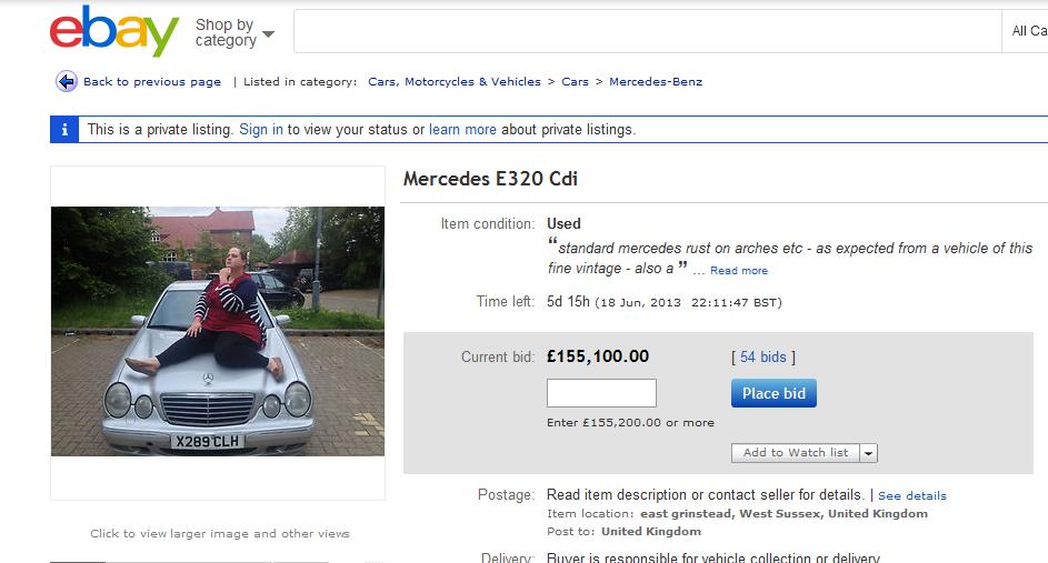 What we encountered is of an UK ad from eBay for 2000 Mercedes-Benz E320 CDI with a voluminous lady posing around the car and even…in the German saloon’s boot.It gets more awkward once you read the description.